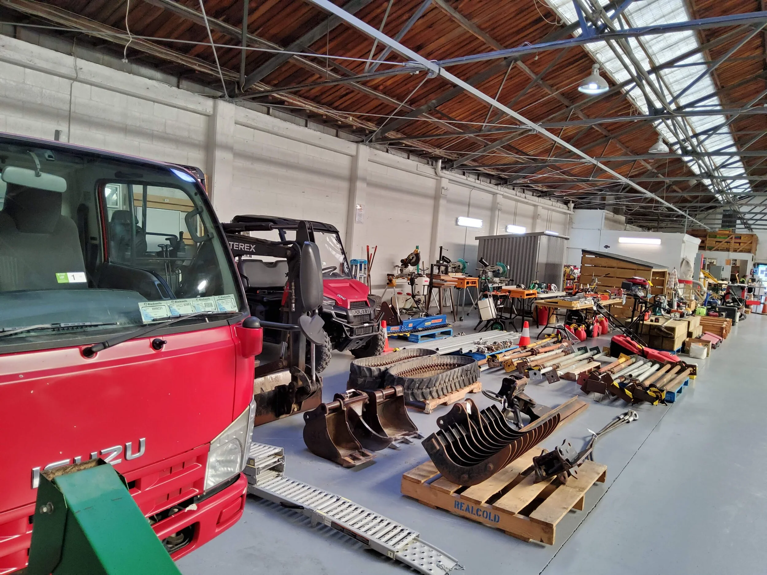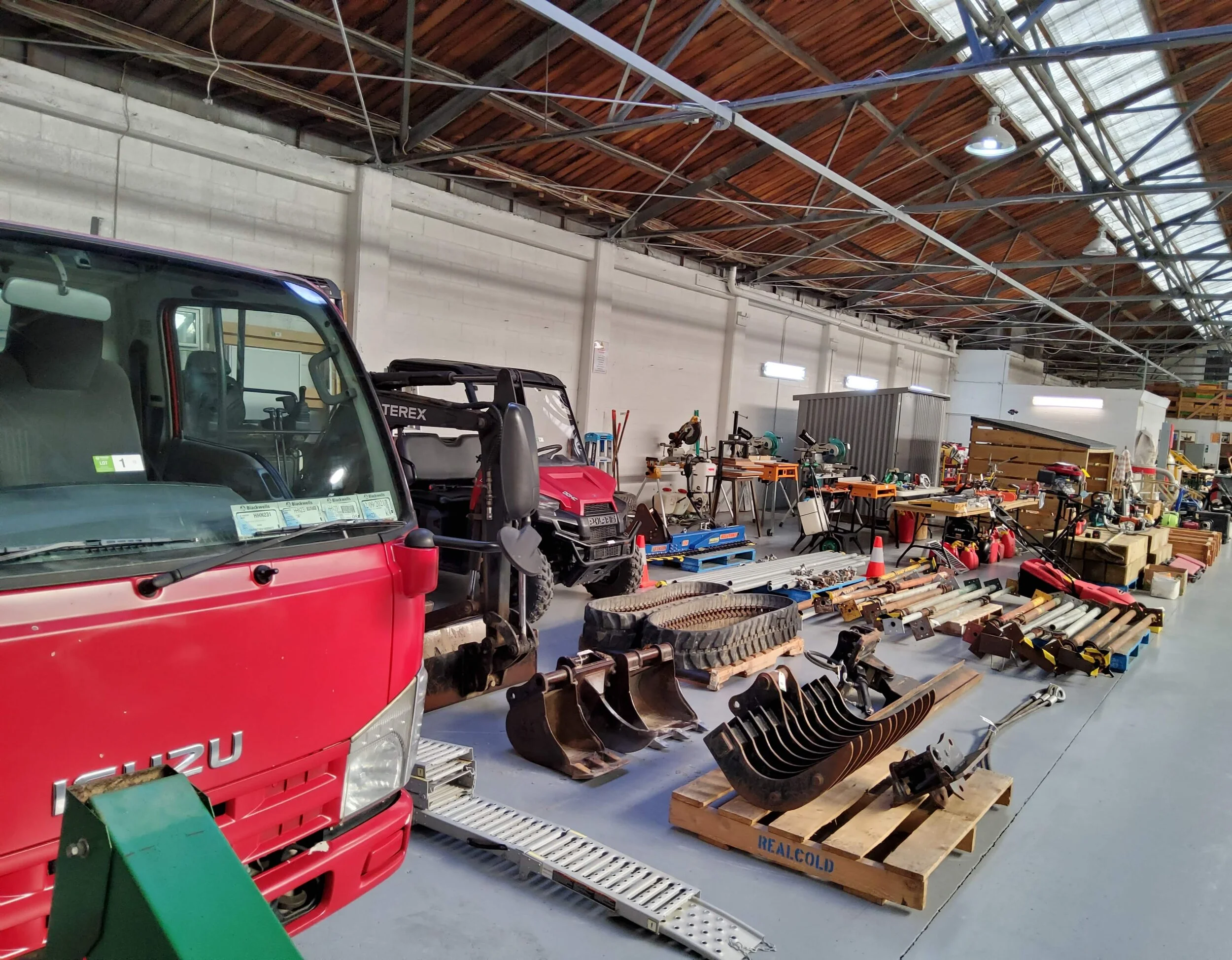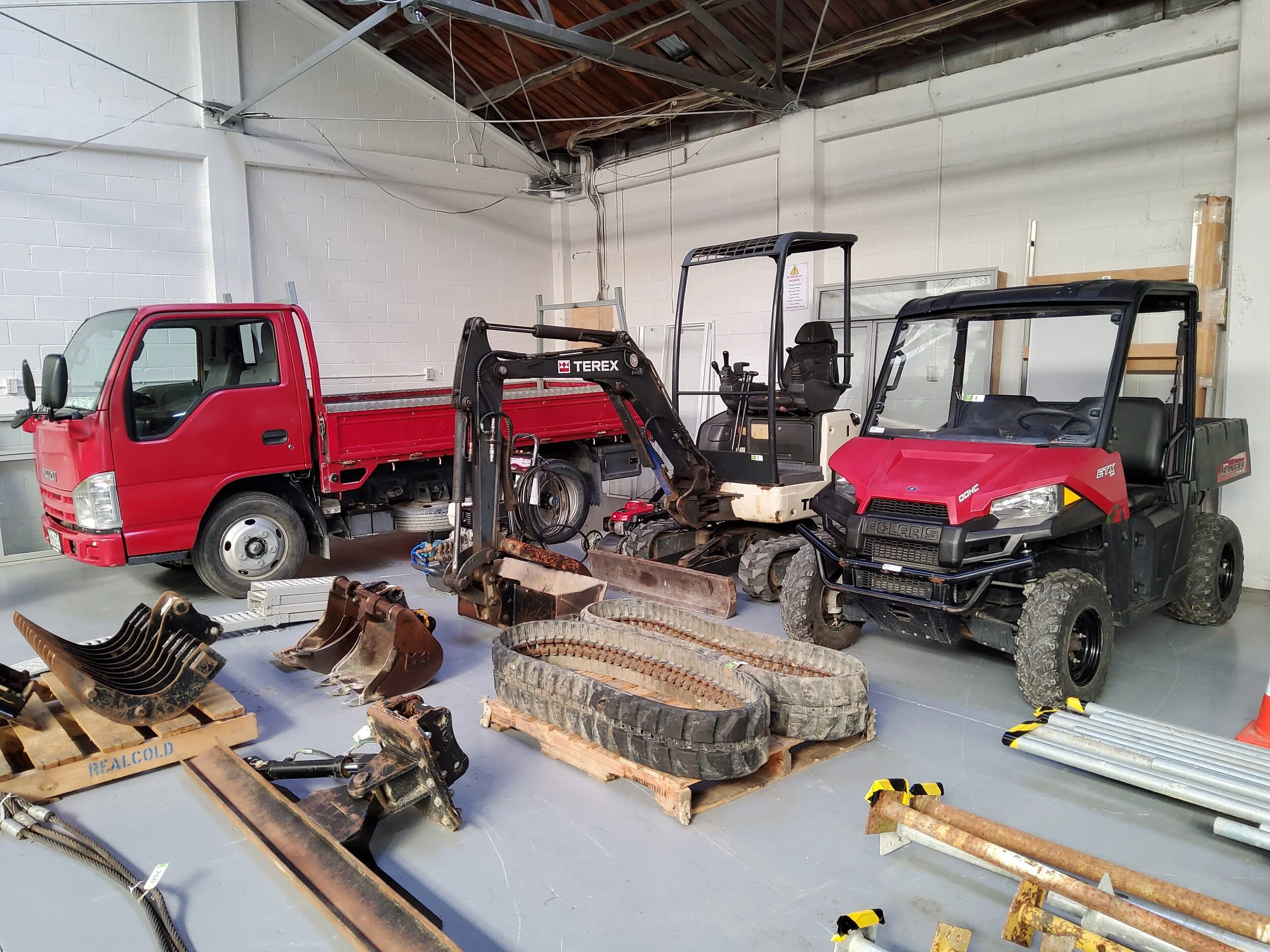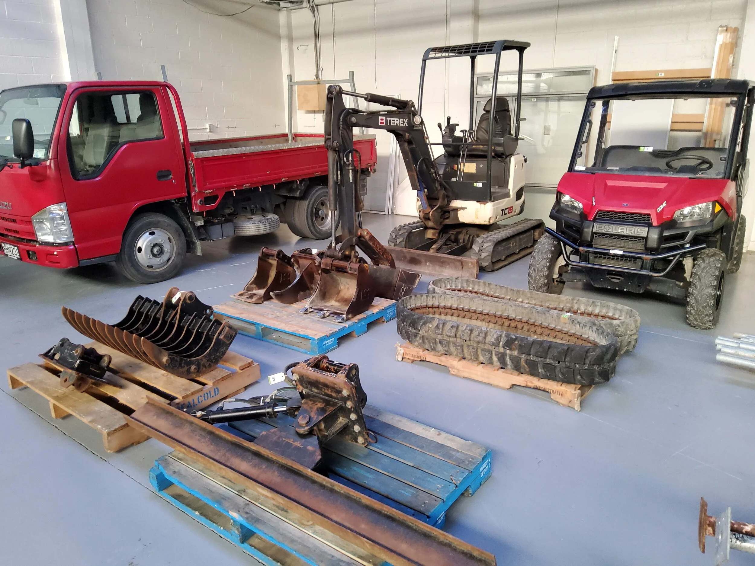Isuzu Elf Truck, Terex T19 excavator & accessories, Polaris 4 x 4 Ranger, hydraulic hedge trimmer, hydraulic flip screen bucket, chain saws, line trimmers, new sheds, brush chipper, assorted timber, table saw, bandsaw, power tools, new outboard motors & much more